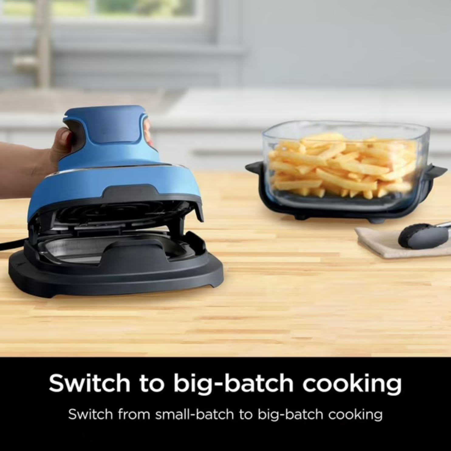 Transform your kitchen with this innovative portable glass air fryer cooking system featuring dual containers for versatile meal preparation. The 4-quart large capacity container accommodates family-sized portions including up to 4 pounds of wings or 2 pounds of french fries, while the convenient 5-cup container is perfect for individual meals, side dishes, or reheating leftovers. This 3-in-1 multifunctional appliance delivers AIR FRY, BAKE, and RECRISP capabilities with professional 1500-watt power comparable to full-sized countertop air fryers.Engineered with premium borosilicate glass containers featuring BPA-free handles, this system eliminates concerns about PFAS and PTFE "forever chemicals" found in traditional non-stick coatings. The transparent glass design allows real-time cooking visibility while the non-toxic materials ensure safe food contact for your family. Both containers are microwave-safe, freezer-safe, and dishwasher-safe, enabling seamless transitions from cooking to storing to reheating. Included storage lids keep food fresh for meal prep convenience.The compact, space-saving design features nestable components that stack efficiently for organized storage in any kitchen cabinet. Permanently fixed heat-safe feet protect countertops including granite, quartz, laminate, marble, and butcher block surfaces. Two aluminum crisper plates with nano-ceramic coating ensure optimal air circulation for crispy, golden results using little to no oil. Perfect for health-conscious cooking, small kitchens, apartments, dorms, RVs, and anyone seeking convenient, nutritious meals without the bulk of traditional appliances.