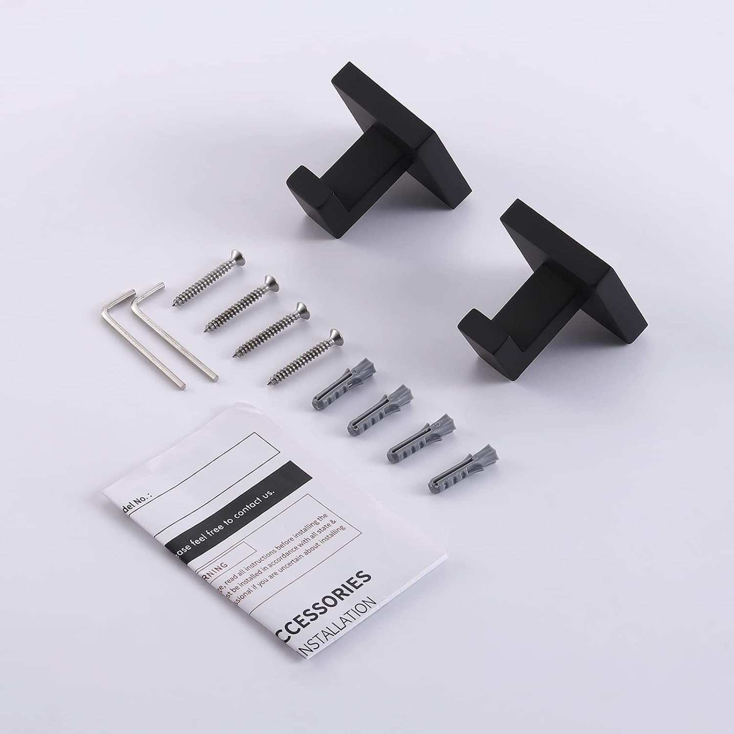 SPECIFICATIONS -Material: SUS 304 Stainless Steel -Screw Material: Stainless Steel -Finish: Matte Black Finish -Max. Load: 5 KG (11 lbs), Screw-Mount on Concrete Wall -Length of the Horizontal Rod:1.18 Inch -Diameter of Screw Hole: 6 MM -Installation Method: Screw-Mounted Package Includes 2 x Towel Hook 1 x Hardware Pack 1 x Installation Instructions