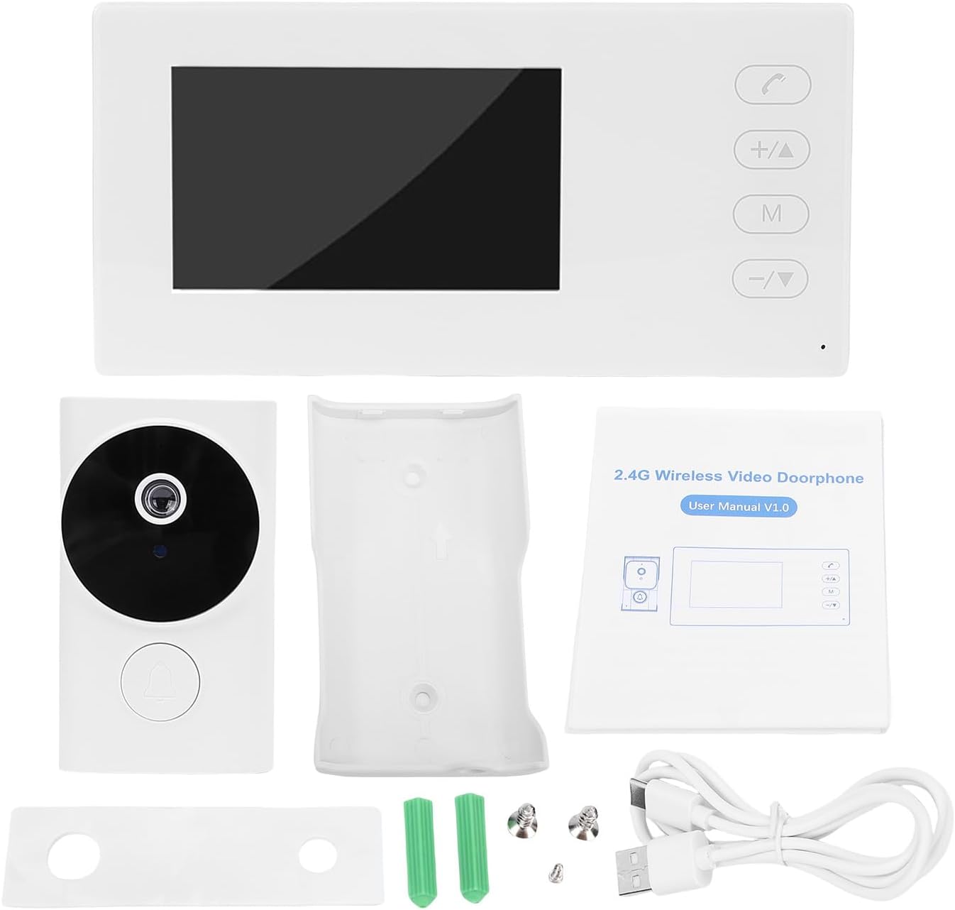 1. Real-Time Communication: The 2.4G Video Doorbell allows you to engage in real-time audio conversations with visitors from anywhere in your home, thanks to its portable design. Experience seamless communication without delays, adding convenience to your daily routine. 2. No Wiring Required: This Wireless Doorbell operates without the need for complicated wiring or a WiFi connection. Simply install the doorbell and monitoring, and enjoy true wireless in your family villa or home without any internet setup. 3. High-Definition Clarity: Equipped with a 720P HD camera and a 4.5-inch LCD touch display, this Video Doorbell ensures crystal-clear video quality, both day and night. With infrared night viewing and a wide 140° viewing angle, you'll never miss a visitor, regardless of the lighting conditions. 4. Long Battery Life: Designed for busy households, our Wireless Doorbell features an impressive battery life, lasting up to one month on standby. The indoor display unit can be powered continuously for added convenience, ensuring you're always connected and aware of who is at the door. 5. Sturdy and Secure Design: With an IP55 water resist rating and robust protection against dust and damage, this Video Doorbell is built to withstand the elements. Built-in speaker and microphone provide superior audio experience, enhancing your home security system effortlessly. Specification: Screen Size: 4.5 inch Screen Battery Type: Rechargeable Battery (built-in)Battery Capacity: 1200mAh Sound: HD Polyphonic Ringtone (6 tones selection) Storage: Supports up to 128G memory card Doorbell: 2 * 2A battery (not included) Material: ABS Size: Approx. 20 * 10 * 3 cm / 7.9 * 3.9 * 1.2 inch packing list: 1 * Display Screen 1 * Doorbell 1 * User Manual 1 * Installation Screw Set 1 * White Adhesive Tape 1 * USB Cable